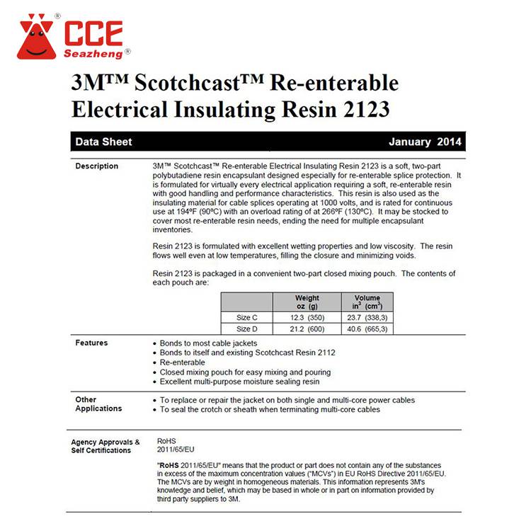 3M Scotchcast Re-enterable Electrical Insulating Resin 2123 is formulated for electrical applications requiring a soft and re-enterable encapsulant with good handling and performance characteristics. The new resin 2123 can be used in many existing applications because it will adhere not only to itself but also to discontinued
