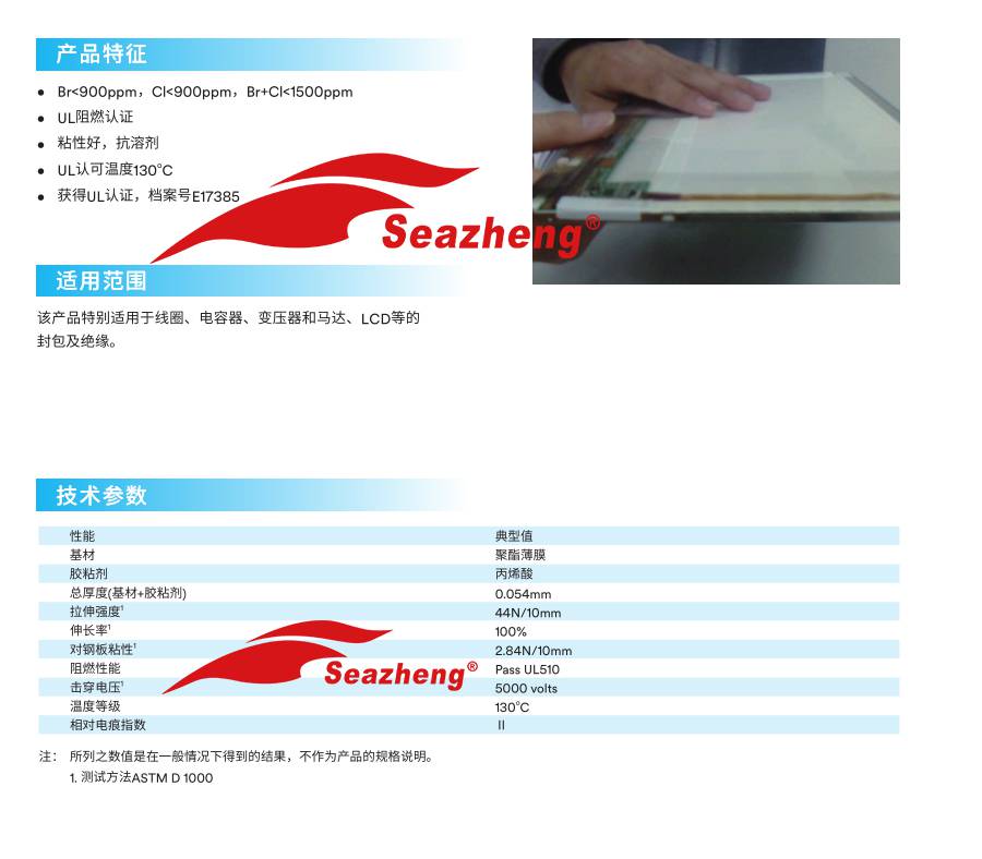 该产品特别适用于线圈、电容器、变压器和马达LCD等的封包及绝缘